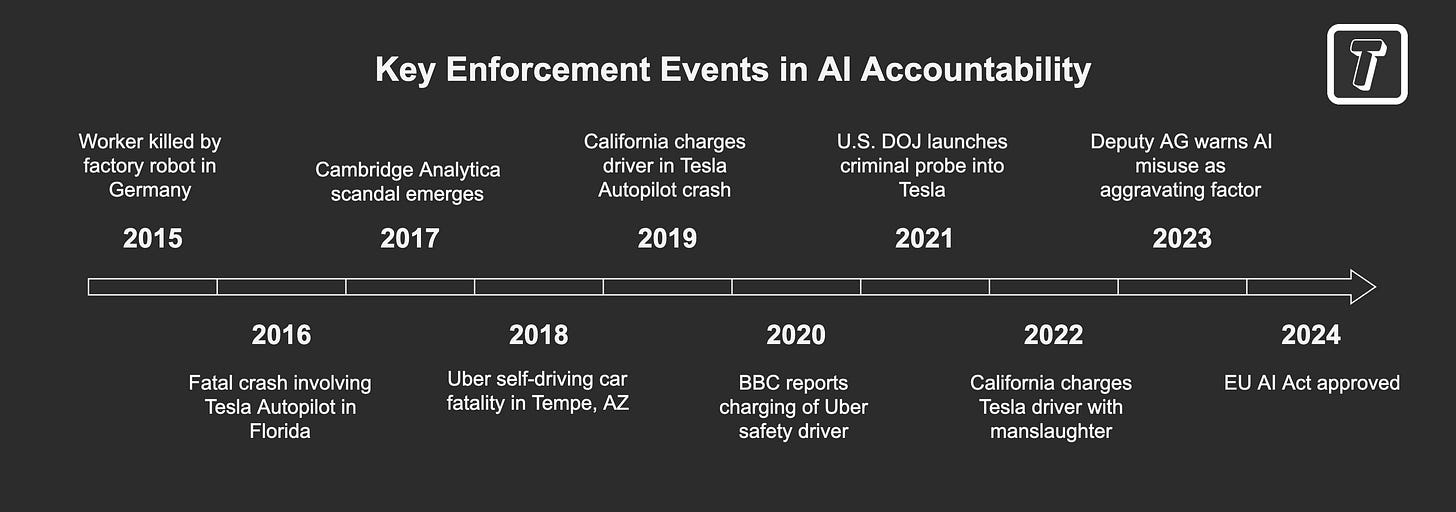 It is useful to see a chronology of how we got here; a sort of timeline of notable incidents and legal actions related to AI harms. Below is a timeline highlighting significant events that have influenced the discussion on AI and criminal liability.