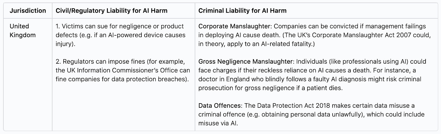 As the tables above shows, civil liability remains the primary mode for addressing AI harms in most places, but the door to criminal liability is opening, especially for severe cases.