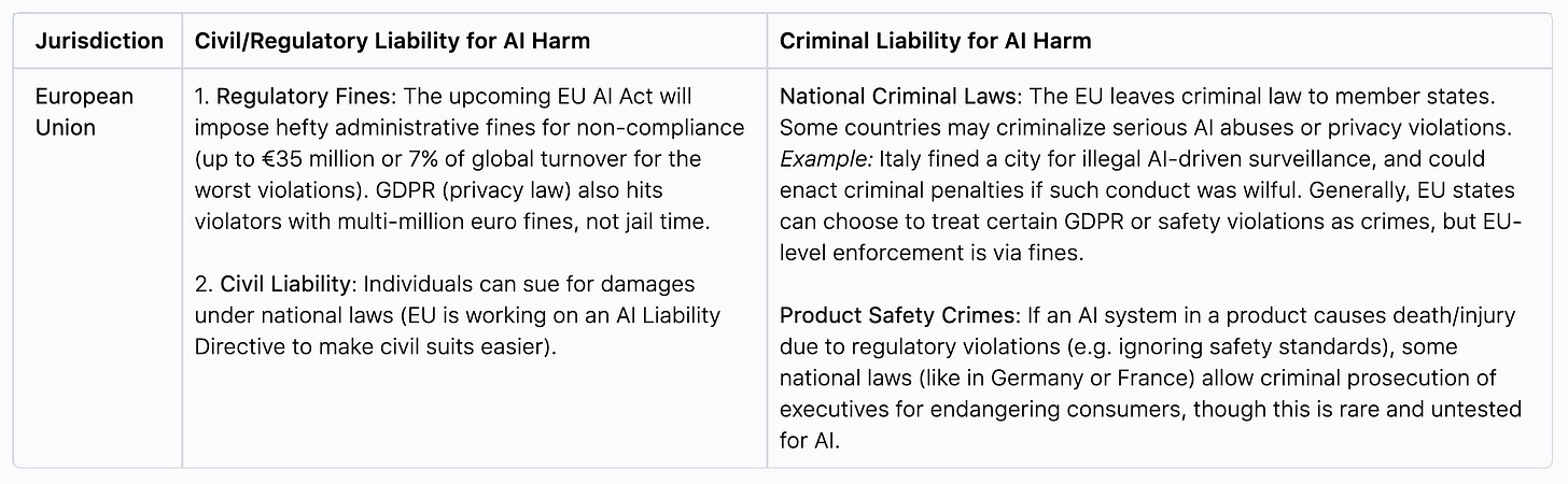 Let us try to clarify the difference with a quick comparison of civil vs criminal liability in the AI context, and how this can vary by jurisdiction: