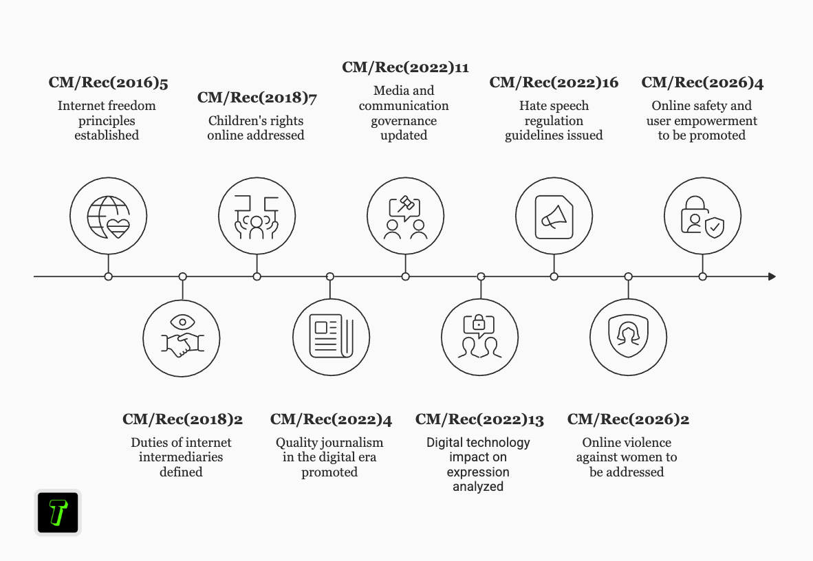 The timeline below illustrates how the Council of Europe has progressively addressed digital rights and online safety through a series of recommendations.