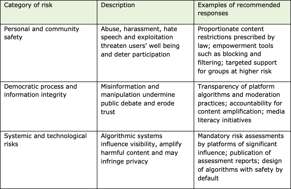 The recommendation identifies distinct categories of online risk, including harm to personal or community well-being, threats to democratic processes and systemic risks arising from technology. It stresses that interventions should be evidence-based, proportionate and grounded in law.