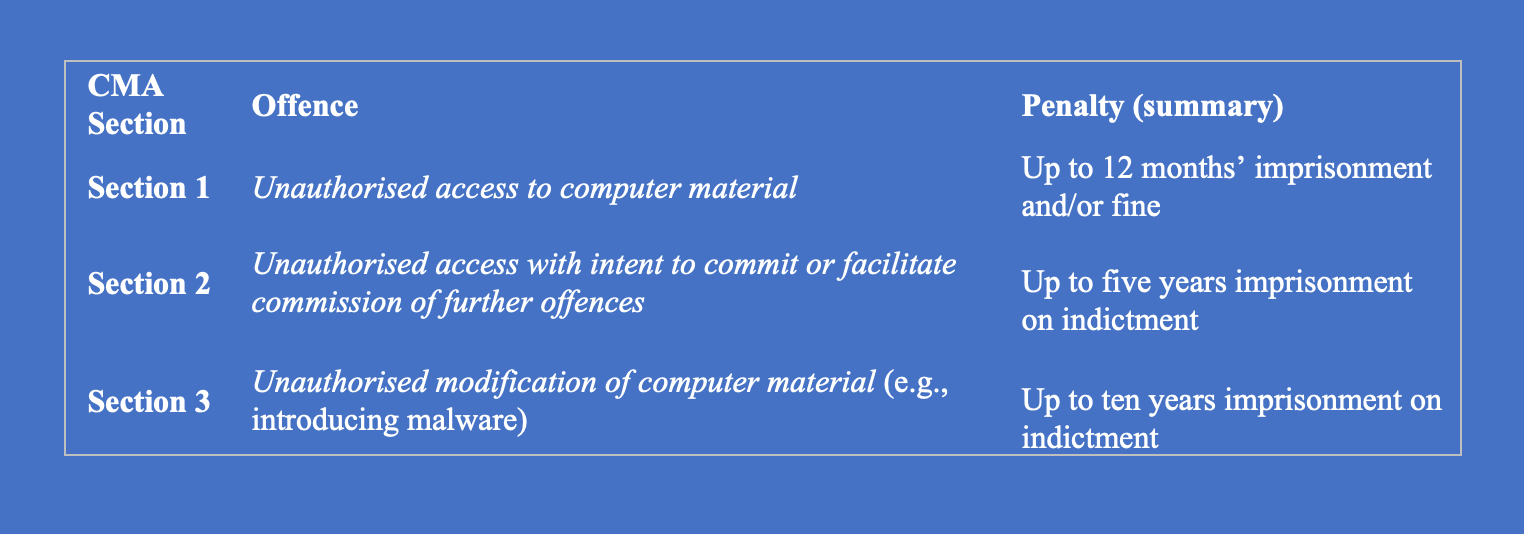 The Computer Misuse Act 1990 (CMA) criminalises unauthorised access to computer systems.