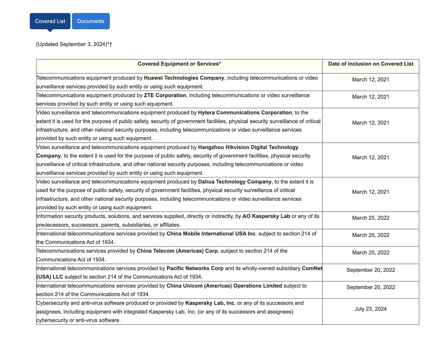 āSpecifically, the FCC may not grant a satellite license, an earth station authorization, or market access to any entity, or an affiliate thereof, that produces or provides communications equipment or services deemed to pose an unacceptable risk to the national security of the United States. (The FCC maintains a list of such equipment and services, known as the Covered List. Providers of such equipment and services include, for example, Huawei Technologies Company and ZTE Corporation.)ā
