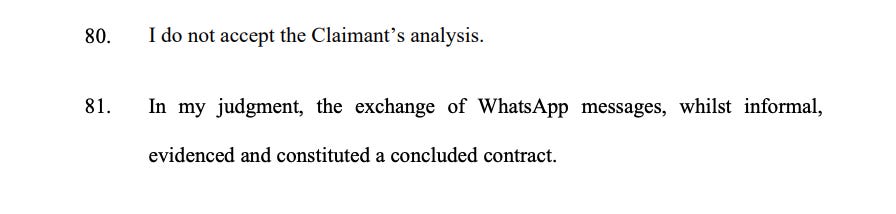 Essentially, the court had to decide how far informal WhatsApp messages can go in forming legally binding agreements in commercial construction projects.