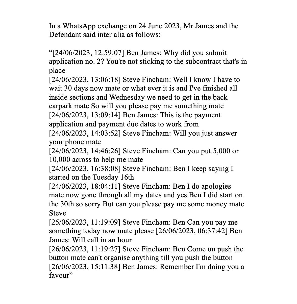Disputes escalated. Jaevee claimed the official contract sent on 26 May was binding. Fincham maintained that the 17 May WhatsApp conversation was the true contract formation point, especially as he had already begun work and received no rejection of that interpretation.