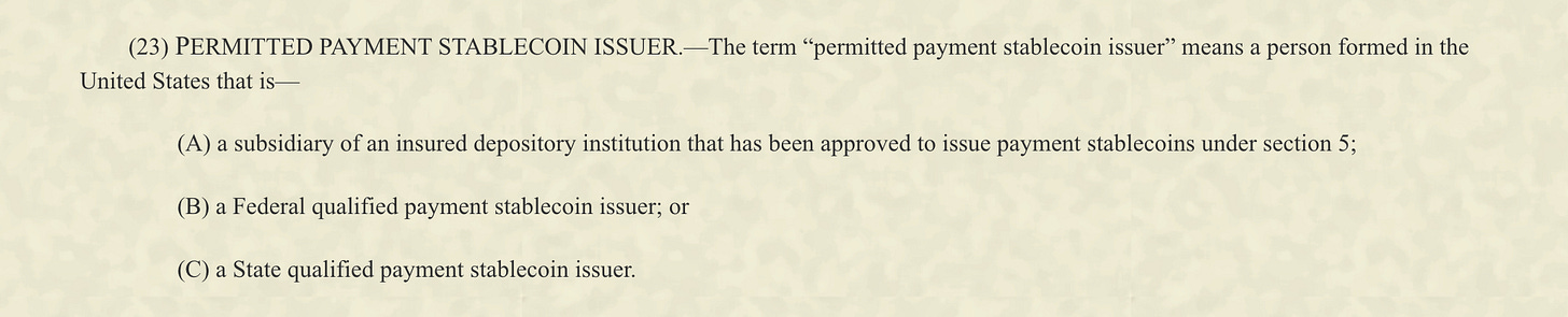 The GENIUS Act makes it clear that permission is contingent not only on compliance with technical standards, but also on the nature and identity of the issuer.