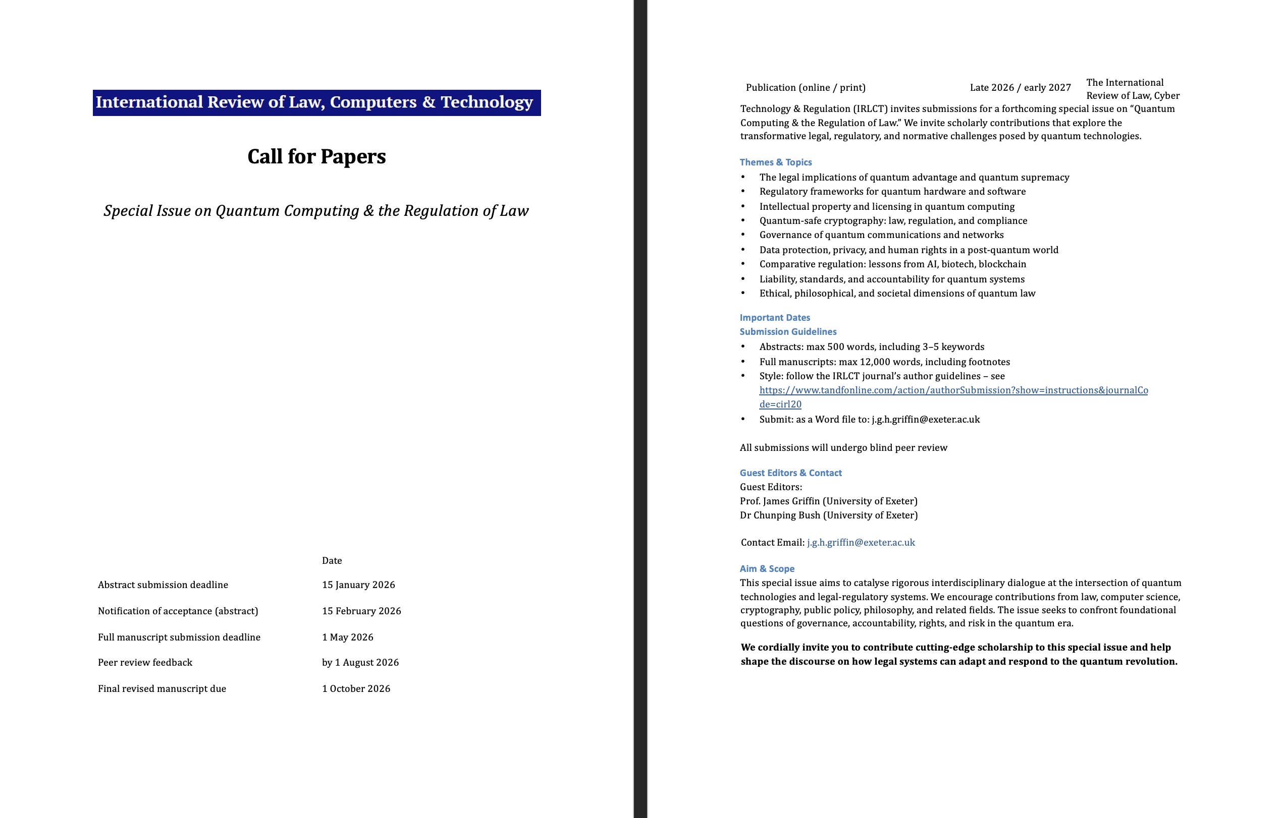 The International Review of Law, Cyber Technology & Regulation (IRLCT) has issued a call for papers for a forthcoming special issue titled Quantum Computing and the Regulation of Law.