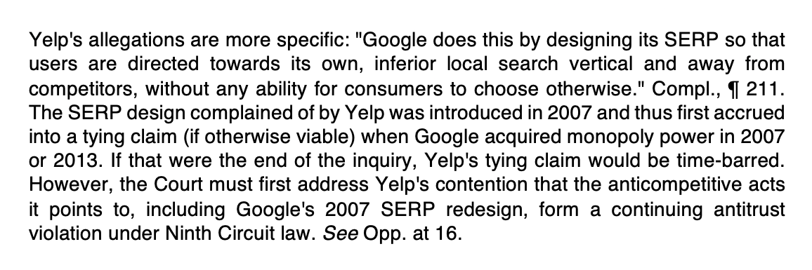 The court determined that Yelp waited too long to bring that particular claim, and so it could not continue in the current lawsuit.