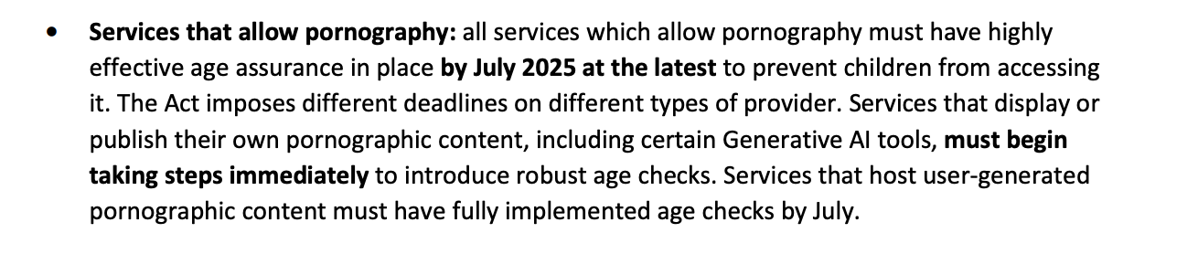 The same date also marks the full implementation of mandatory age assurance for services that host pornographic content uploaded by users.